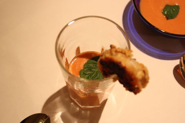 Ca. 6 Teile Tomaten zu 3 Teilen anderes Gemüse (Gurke, roter Paprika, Jungzwiebel) grob schneiden. Sowie ca. 4-5 Teile Erdbeeren. Pro Kilo Gemüse ca. 1 Scheibe Toastbrot in Wasser einweichen und zugeben. Nur ganz wenig Knoblauch, auch gut Öl und Salz, einen kleine Schuss Weißweinessig sowie eine Prise Zucker. Schön aufmixen und auf eine cremige Suppenkonsistenz bringen. Kaltstellen.