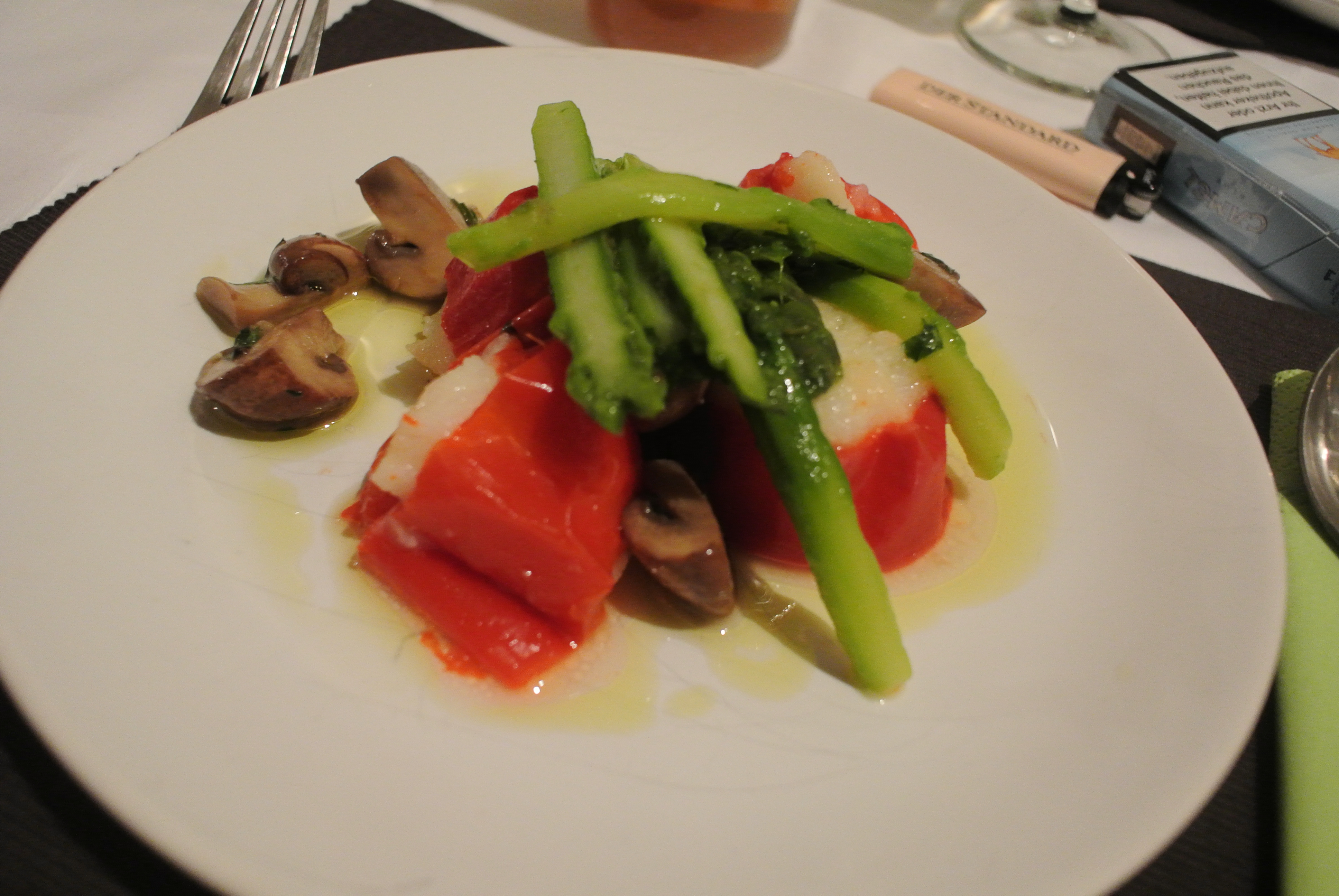 Die Champignons vierteln in einer Pfanne scharf anbraten (+ganzer Knoblauchzehe für den Geschmack), würzen, mit etwas Weißwein ablöschen und mit etwas von dem Süß-Sauer-Sud aufgießen. Abschmecken und geschnittene Petersilie und Olivenöl einmischen. Spargel mit gleicher Marinade, aber separat marinieren.