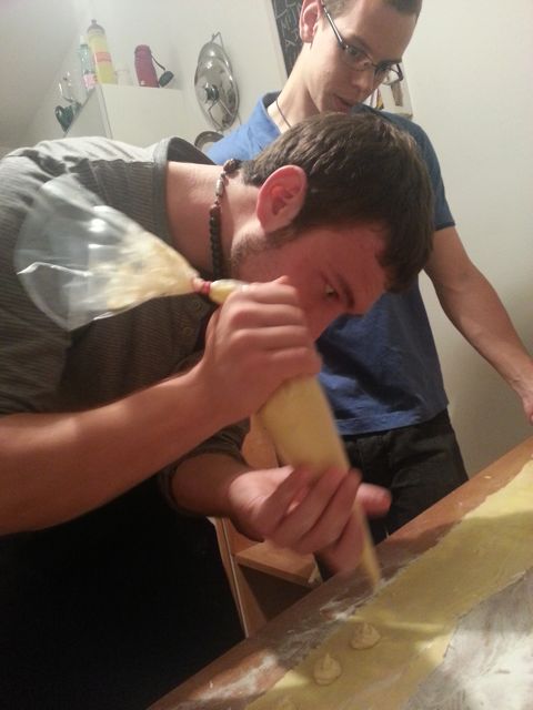 Dann die Tortellini herstellen. Dafür den Pastateig mit einer Nudelmaschine dünn ausrollen. Die Fülle in einen Spritzsack füllen und wie im oberen Foto auf den Teig aufspritzen. Danach, wie wir ja alle gemeinsam gelernt haben, die Tortellini formen und auf ein bemehltes (! ;)) Blech geben.