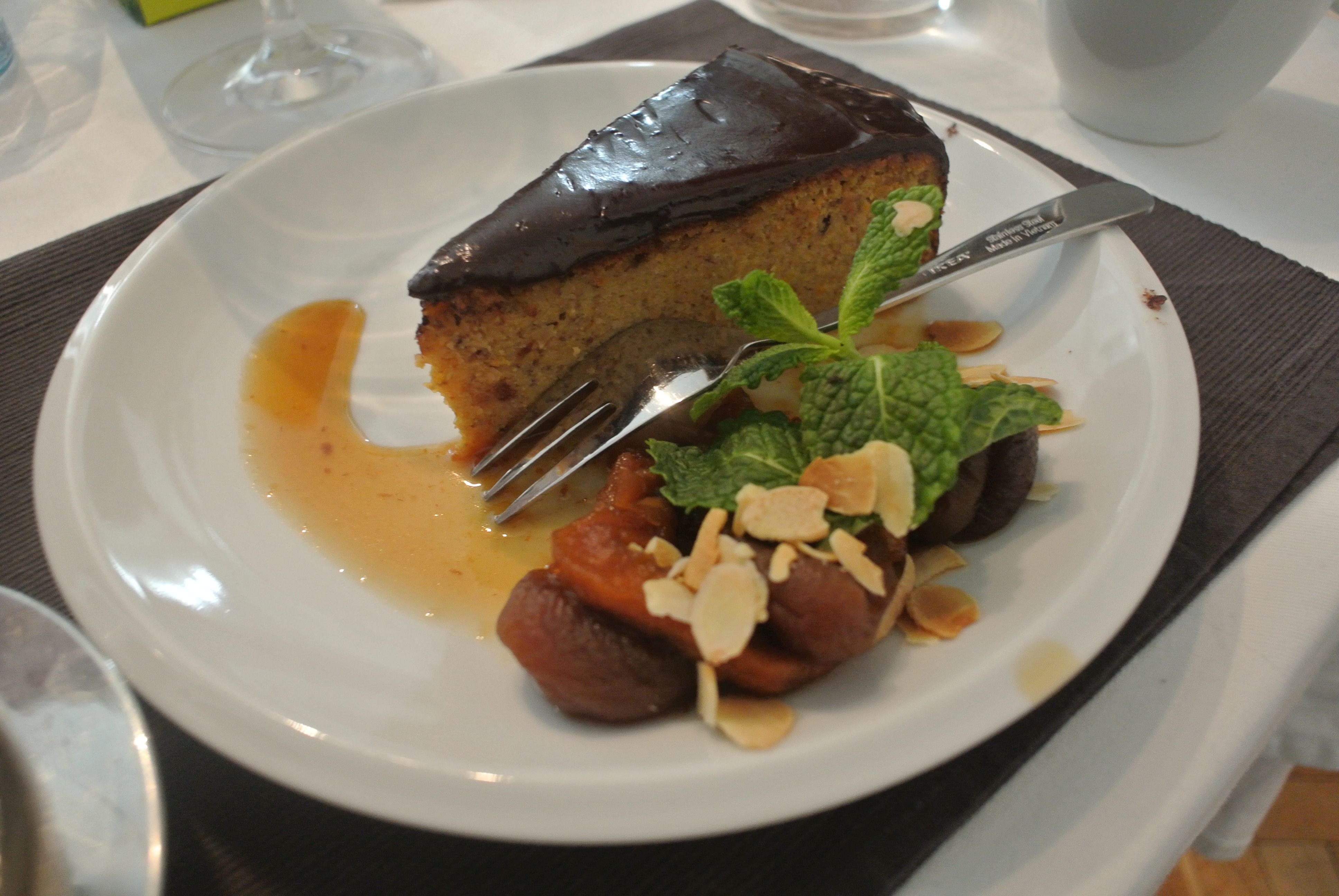 Fertige Tarte auf Trockenfrucht-Kompott anrichten mit gerösteten Mandelblättchen und Minzspitzen garnieren.