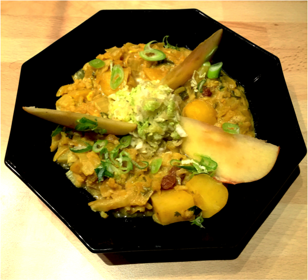 Die Zwiebel fein schneiden und in Olivenöl weichschwitzen, anschließend das Kreuzkümmel- und Kurkumapulver etwas mitanschwitzen. Kurz danach den in Streifen geschnittenen Chinakohl einrühren, kurz anschwitzen gut salzen und das heiße Wasser/Fond dazugießen. Lorbeer- und Limettenblatt, Honig zugeben und aufkochen. Anschließend die in mundstückgroß geschnittene Erdäpfel zu geben, sowie den Reis und beides weichkochen. Zuletzt das Cashew-Mus, die Rosinen, die Jungzwiebel und je nach belieben auch frischen grob gehackten Koriander einrühren – eventuell noch etwas Wasser einrühren. Mit Zitronen- oder Limettensaft, Salz und eventuell mehr Kreuzkümmel und Kurkuma abschmecken und genießen.