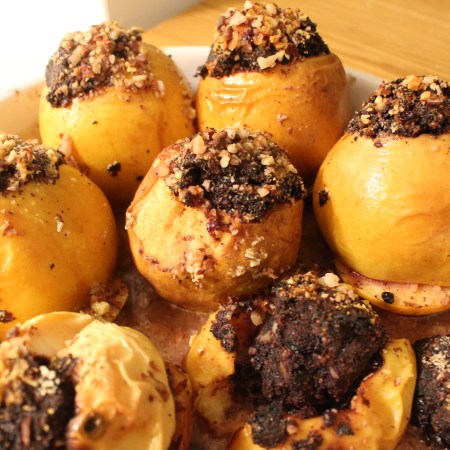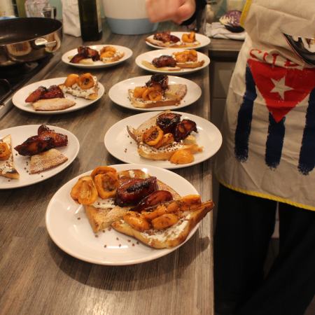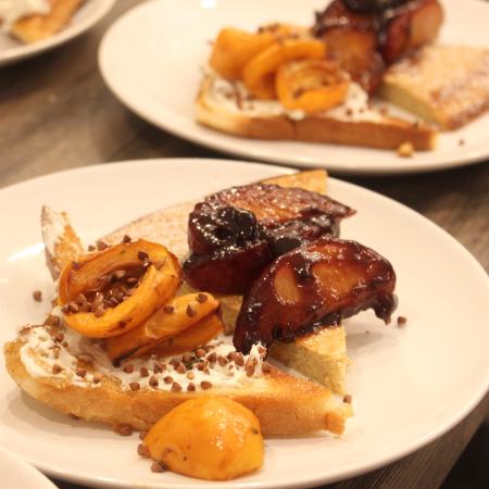 Warme Honig-Mispeln, karamellisierter Topfen-Toast, gerösteter Buchweizen