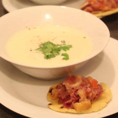 Schwarzwurzelsuppe mit Maistortilla und rotem Zwiebelchutney