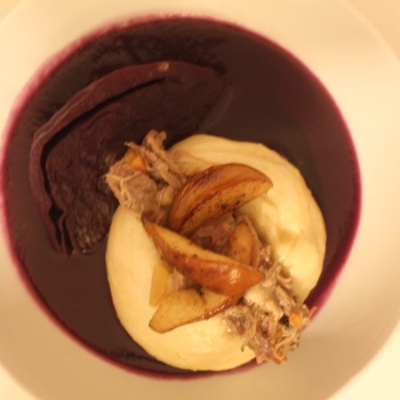 PulledGoose auf Bao Bun, Rotkraut-spalten, Knusperhaut, Birne