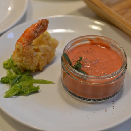 Erdbeer-Salmorejo und Mandel-Garnelen