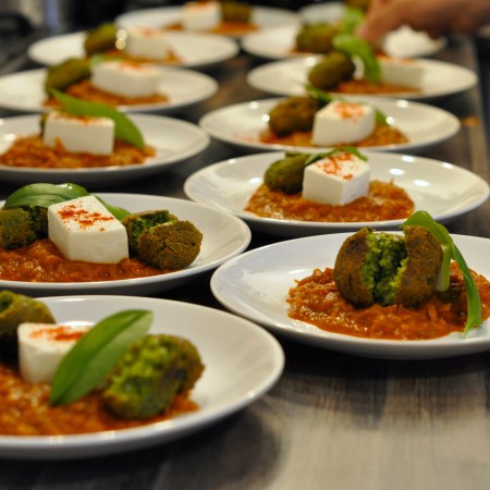 Bärlauchfalaffel auf Erdäpfelgulasch:Neu mit warmen Schafskäse