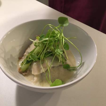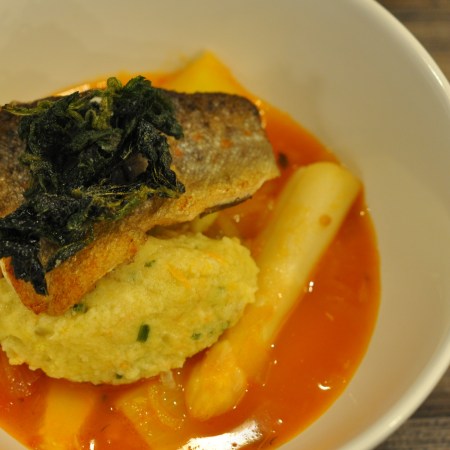 In Spargelmilch pochiertes Saiblingsfilet, grüner Spargelsalat, Emmerweizen