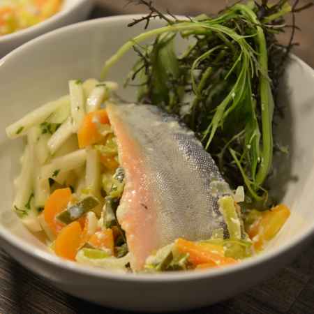 Saibling in Milch pochiert mit Hirse und Kohlrabisalat