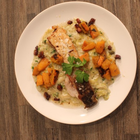 Gebratener Biokarpfen auf rahmigen Chinakohl und Kurkuma-Serviettenknödel