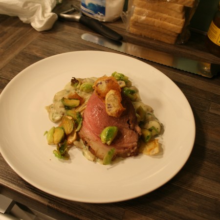 Rosa gebratener Kalbsbraten auf Sellerie-Haselnusscreme und Orangen-Kohlsprossen.