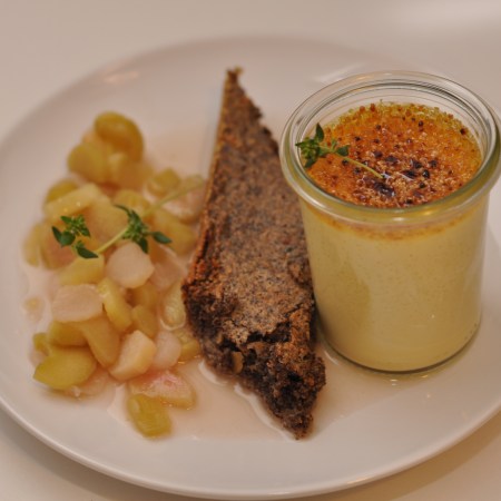 Spargel-Cremebrulee Rhabarber-Spargelkompott, luftiger Mohnkuchen