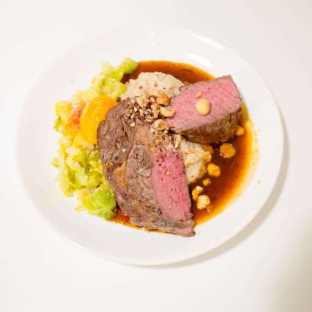 Rosa gebratener Kalbsbraten auf Sellerie-Haselnusscreme und Orangen-Kohlsprossen.