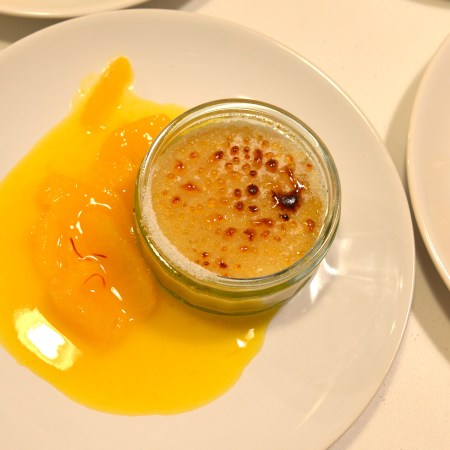 Orangentarte mit Safraneis, dunkler Schokolade und marinierten Himbeeren