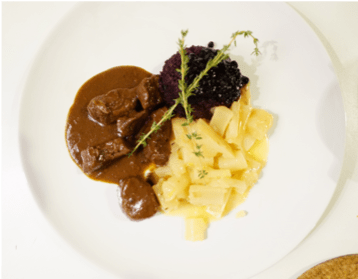 Rosa gebratener Kalbsbraten auf Sellerie-Haselnusscreme und Orangen-Kohlsprossen.