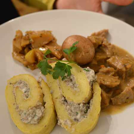 Zicklein-Ragout, Erdäpfel-Roulade mit Ziegenkäse-Pilz-Füllung, Apfel-Pastinaken-Chutney