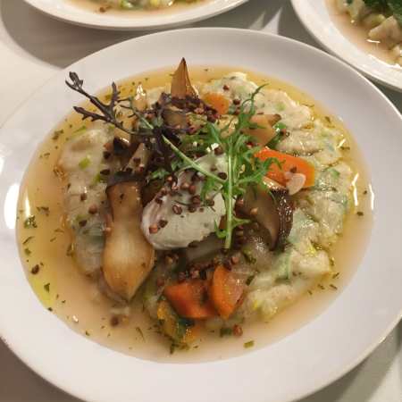 Pikanter Sojagrieß mit Lauch, Süß-Sauer-Gemüse, Kräuterseitlinge, gerösteter Buchweizen, Ziegenkäse
