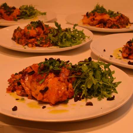Spanische Paella mit Hühnchen, Rucola, getrockneten Oliven und Aioli