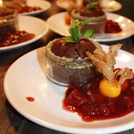 Flüssiger Schokokuchen mit Zwetschken-Panaché und Karamellisierten Physalis