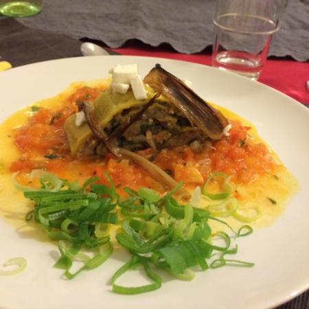 Mediterrane Nudelroulade mit Mangold, Melanzani und Schafskäse auf gelben Tomatenragout, gegrillte Ishikura Jungzwiebel